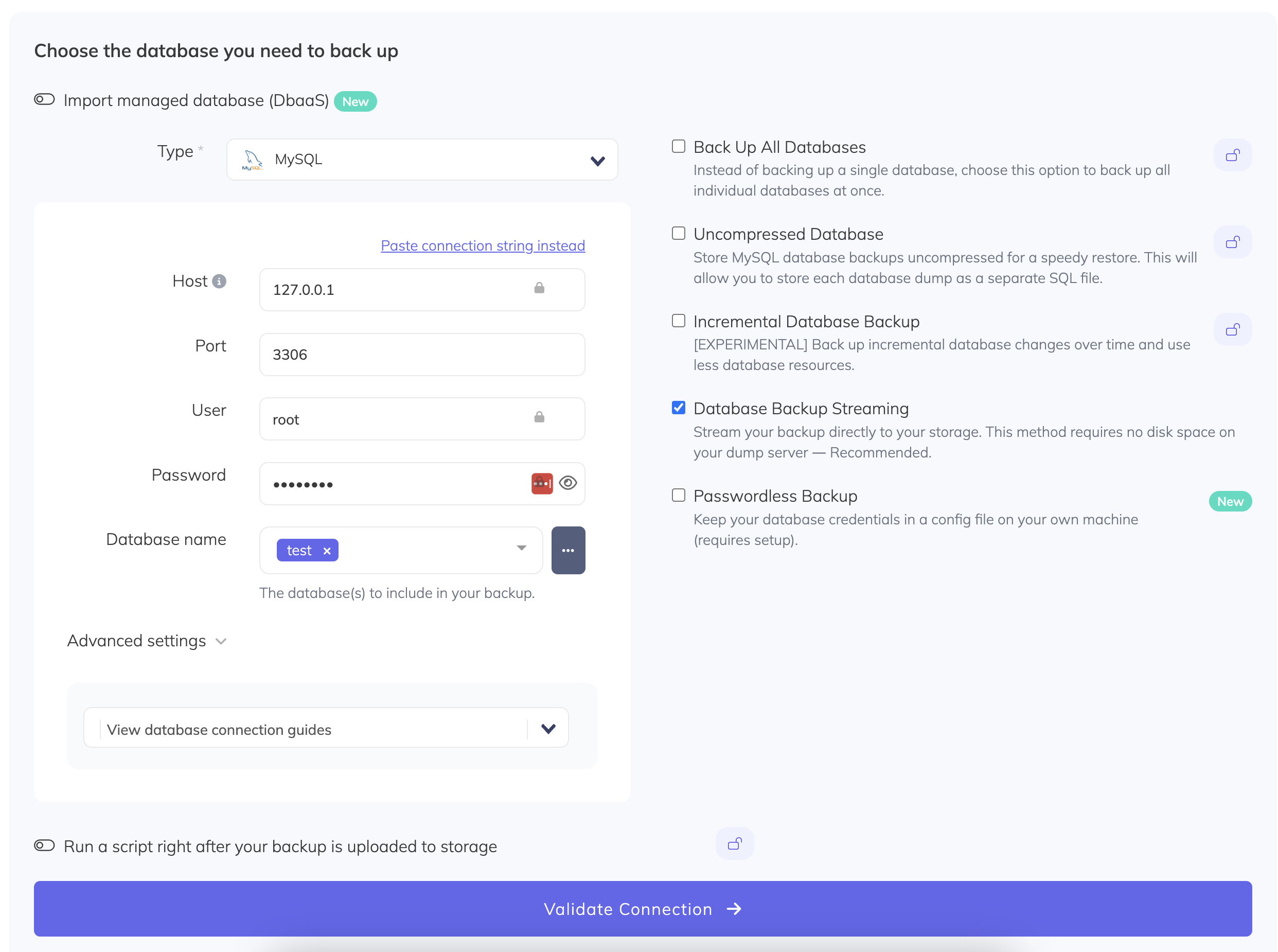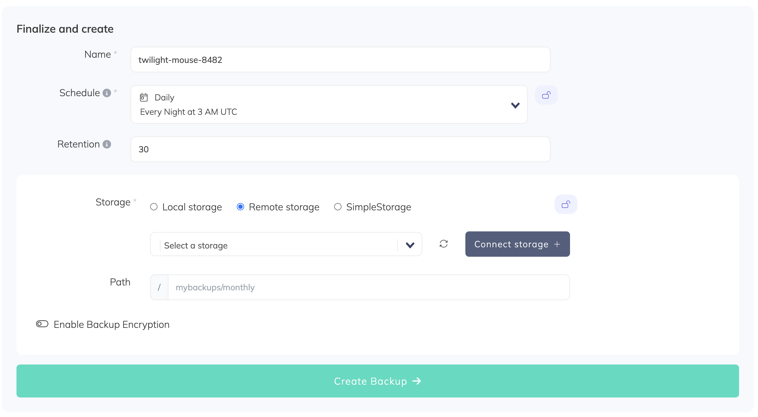 Choose a name for your backup (this is how it will be displayed in the SimpleBackups interface) and select a storage location.