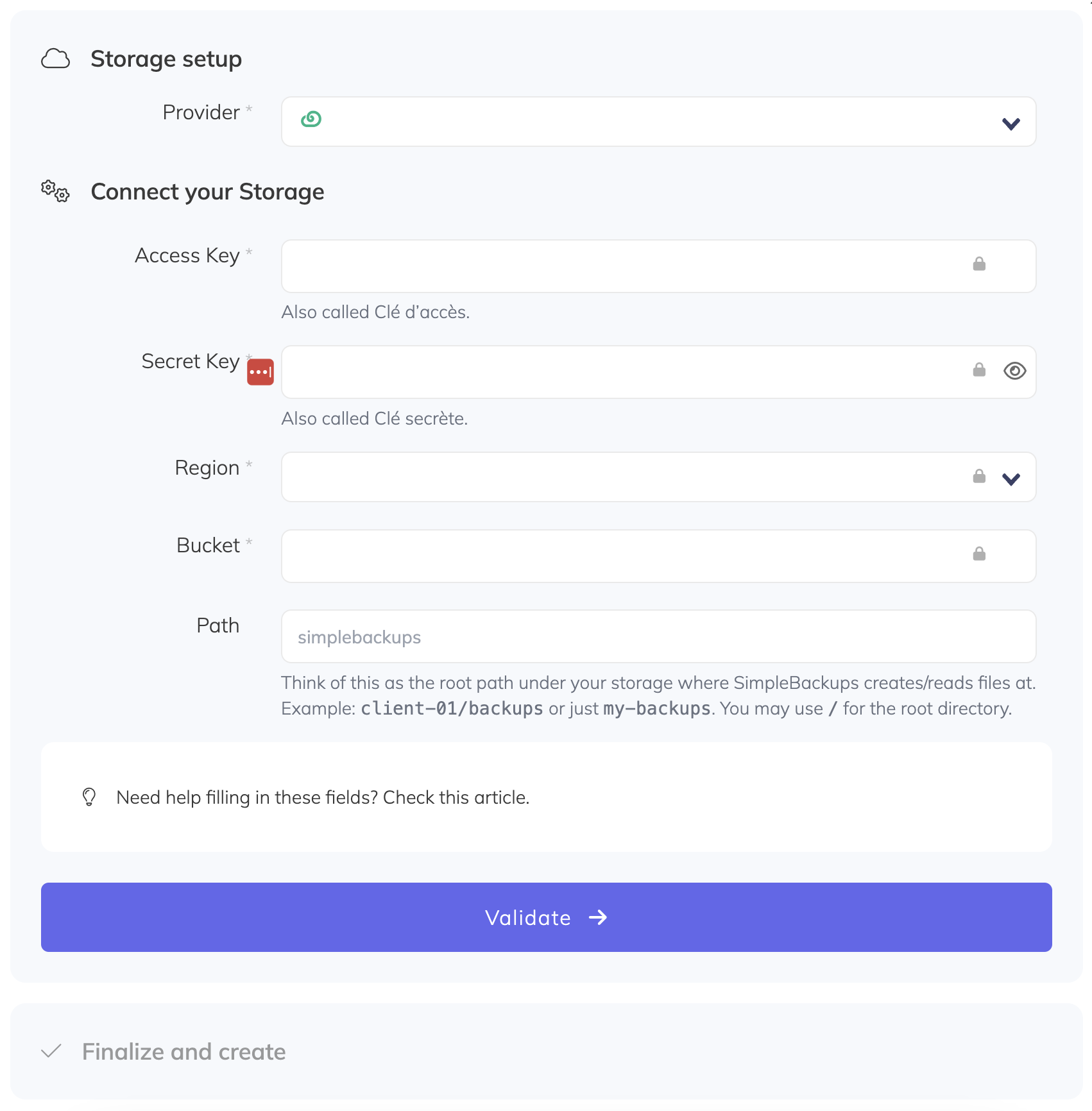 It is important to note that this section will remain the same regardless of which storage option you choose. The benefit of this is that if you decide to switch storage providers (such as Leviia, Backblaze or AWS), all you need to do is select your new provider from the list and you will be ready to proceed.