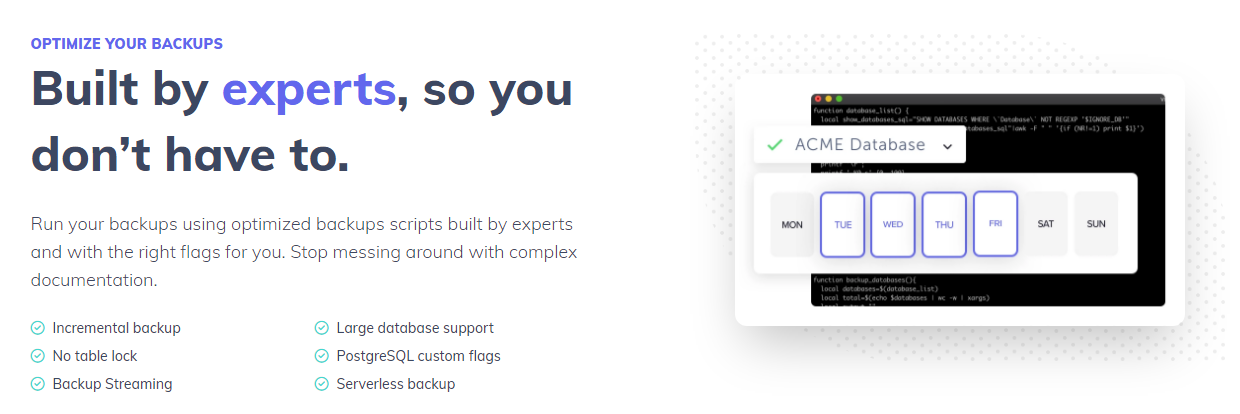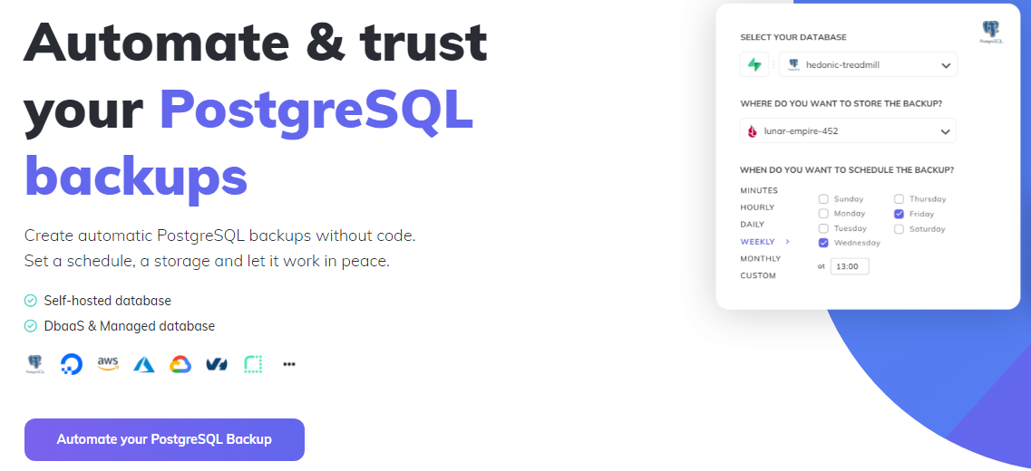 It enables you to create automatic PostgreSQL backups without code. It is ideal for its easy-to-use interface and accessibility that simplifies the technicalities of the process.