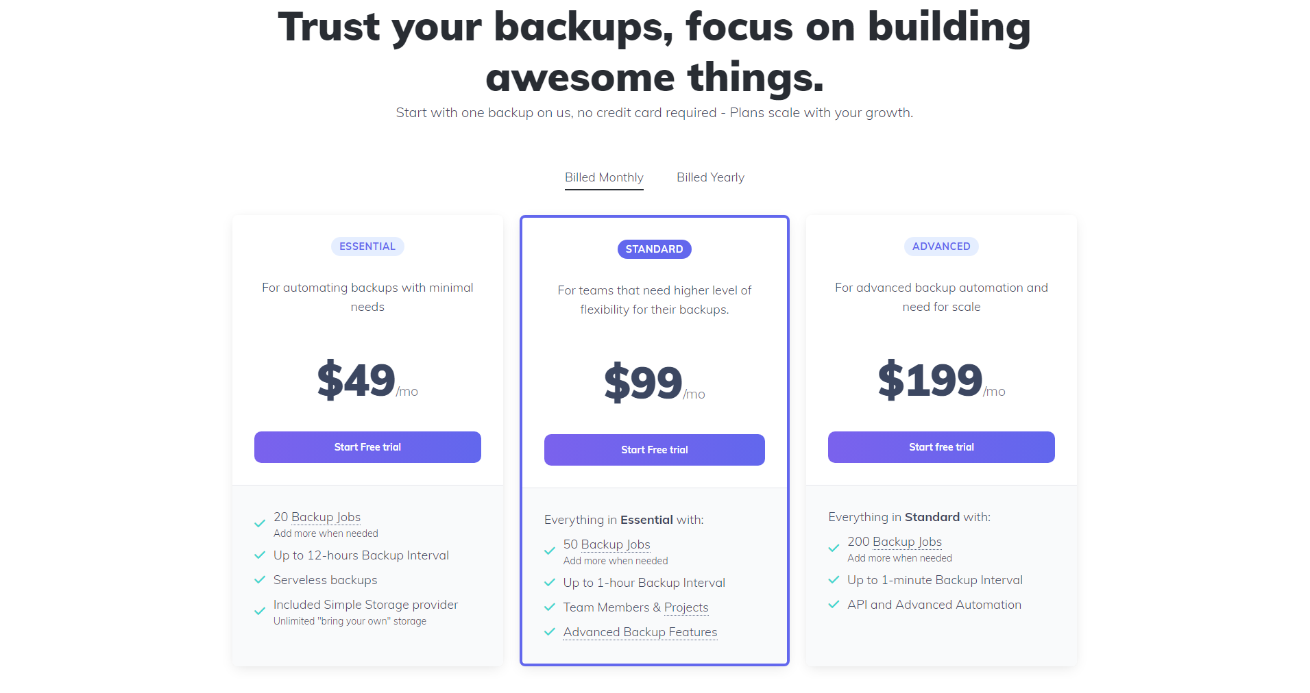 SimpleBackups offers flexible pricing plans for monthly and yearly billings and a 7-day free trial without credit card requirements. You can test its features before committing to a fixed plan.